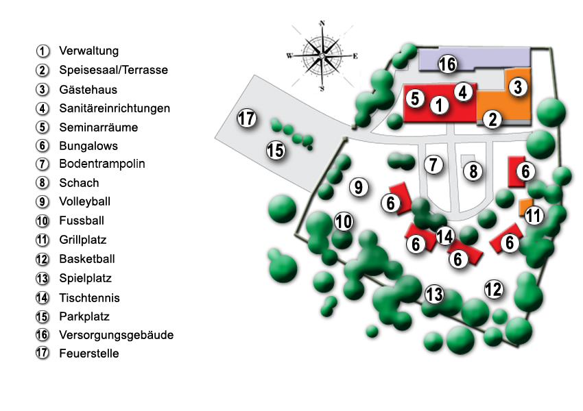 Das gesamte, großzügig angelegte Gelände ist durch einen Zaun eingefriedet und begrenzt. Es befinden sich hier Grünflächen für Ballspiel, Tischtennis, Federball, Großschach, Tischbillard, Boccia, ein Lagerfeuerplatz mit einem Großgrill.
